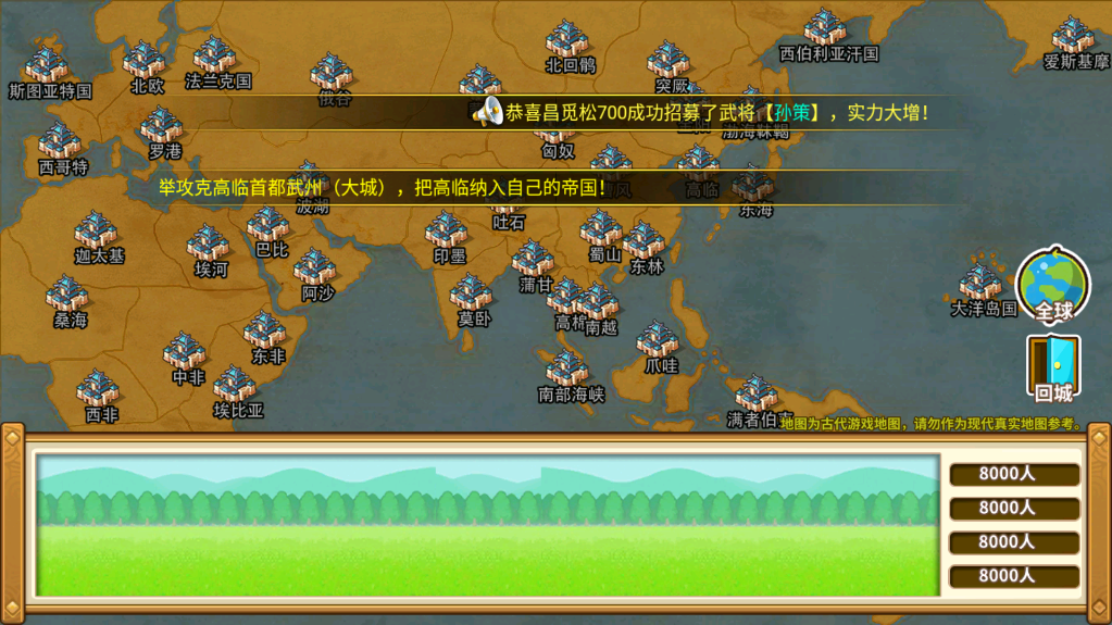 游戏以“重建盛世”为叙事主线,玩家扮演的村长需从管理一个小村落起步,通过经营积累资源、招募名将、扩张领土,最终统一欧亚非美四大洲。世界观设定融合了历史与幻想元素:初始地图位于东亚,玩家需先征服高丽、倭国等势力;中期解锁丝绸之路后,可与波斯、罗马等文明交锋;后期通过航海科技解锁美洲大陆,与阿兹特克、印加帝国争夺资源。这种“从局部到全球”的扩张节奏,既符合历史逻辑,又为玩家提供了持续的目标感。