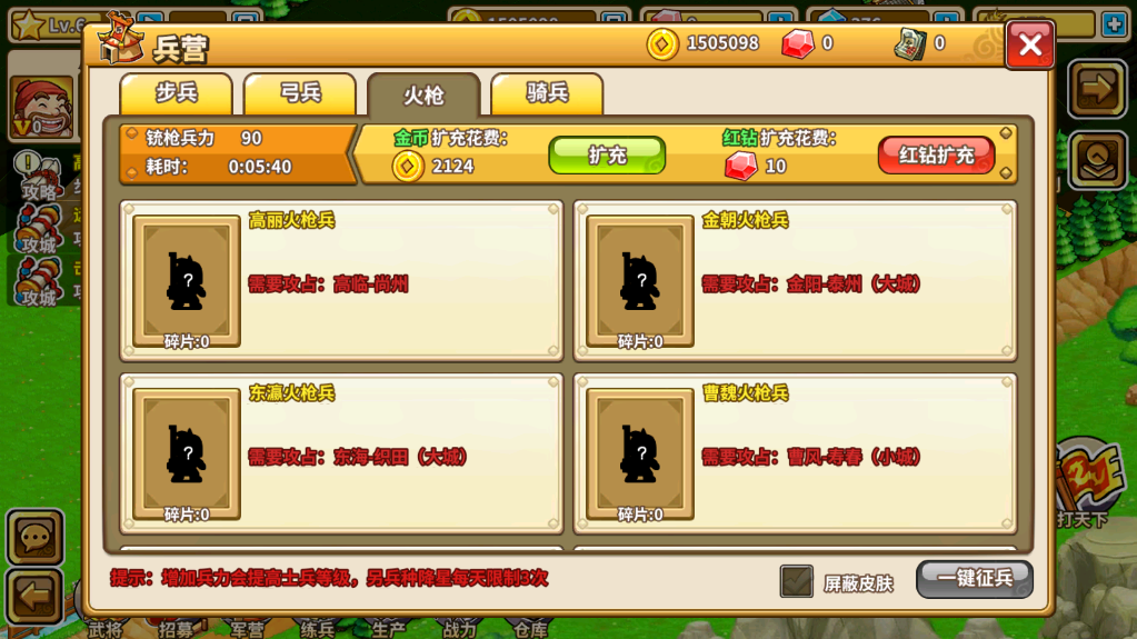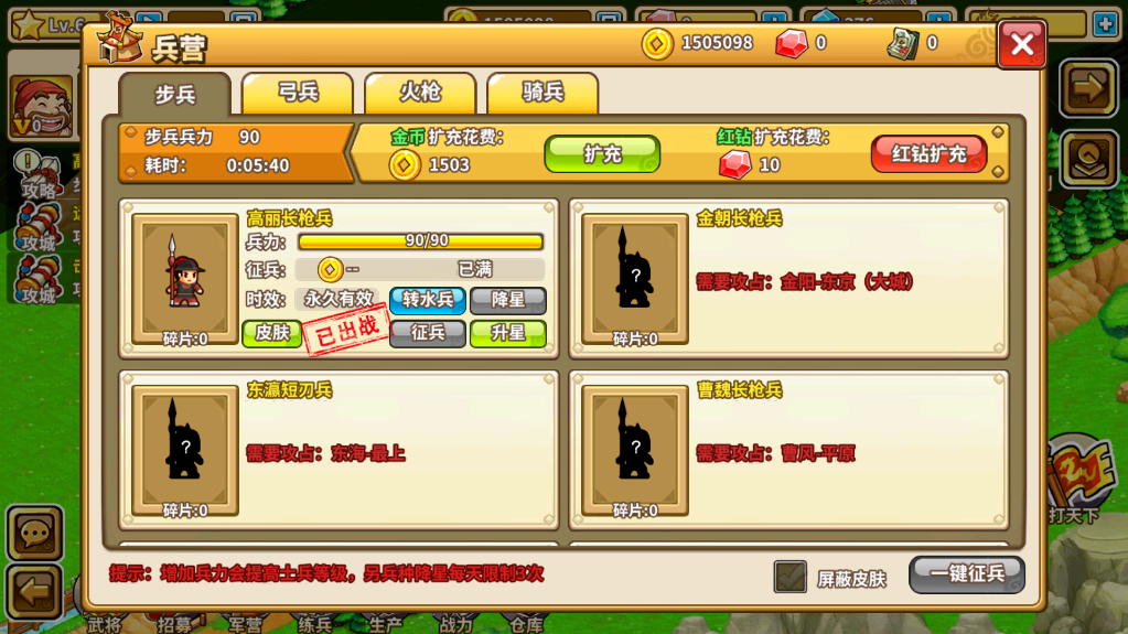 兵力:在兵营,花费金币或者红钻可进行扩充。扩充兵力是按照兵的类型扩充。村长大人的等级决定兵力的扩充上限。