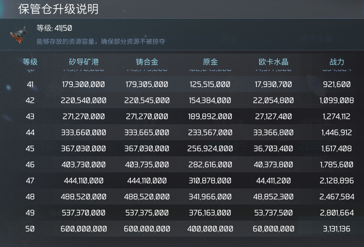 保管仓级别越高,存放的资源就越多,无论是前期发育用于存储多的资源,还是后期打团需要资源调动,保管仓都担任着一个重要的后勤工作。