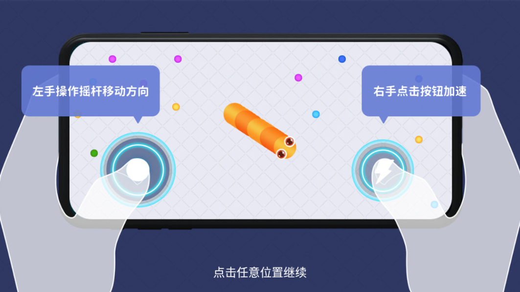1、操作摇杆控制小蛇方向,吞吃小光点成长,成为世界最长蛇蛇!