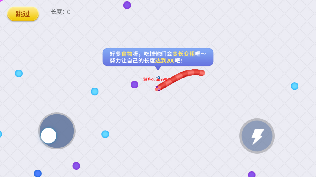 4、控制你的蛇吃掉画面中的圆点,这些圆点是食物,吃掉他们以后,蛇就会边长变粗;当然,在游戏中还会出现其他的蛇,玩家需要灵活利用加速和策略,只要让敌蛇的头部碰到你的身体,敌蛇就会死亡并留下海量“遗产”!