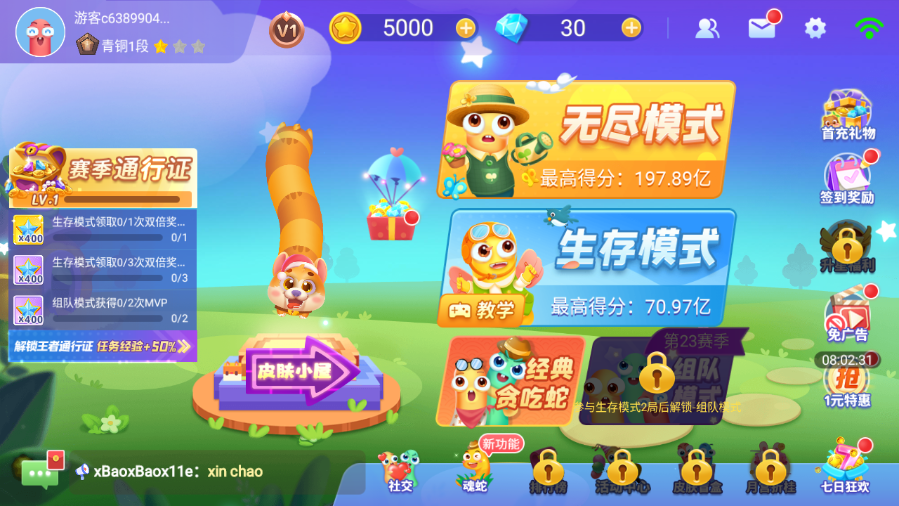 超经典的贪吃蛇游戏手机对战版本,贪吃蛇在线手游这里拥有丰富的玩法,全新的挑战对战模式,不仅要拼速度还要考验你的策略,新的清新地图已上线,签到可以获得金币,还有很多个性化的皮肤,无尽的模式等你来挑战,看你能否拿到第一名。