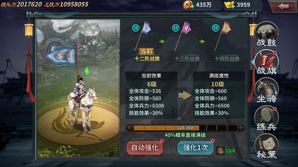 坐骑拥有强化等级、坐骑技能、稀有坐骑三项内容,均可对战力有所提升,同时加持给武将。