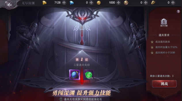 无尽深渊是一个单人 爬塔式的玩法,有多个关卡,每个关卡有三个通关条件,每达成一个会获得一颗星。通关后按照获得星星数量进行结算,一星、两星、三星分别对应三个奖励,每种奖励只能获取一次。只有三星通关才能挑战下一关卡,并且只有三星通关才会消耗每日的挑战次数。