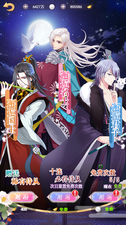 4.邂逅(3级开启):陛下可在邂逅中消耗货币,获得丰富的道具和侍从,达到vip11级还可开启邂逅国士~有机会获得更优秀的侍从哦!