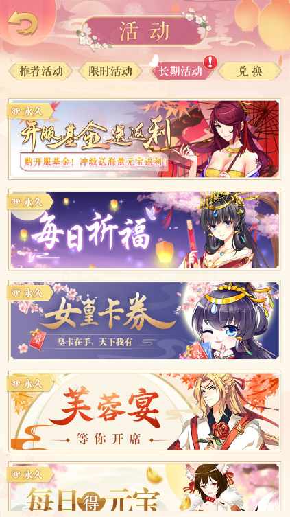 10.活动(通关灵境关卡1-4开启):活动中包含限时活动、长期活动和兑换。陛下可在活动中查看并参与丰富多彩的活动,也可在兑换中输入兑换码获得奖励哦~兑换码会不定期发放哦,届时会通知各位陛下的~
