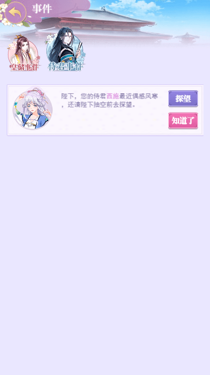 11.事件(通关灵境关卡2-9开启):事件中包含了皇子出仕结缘相关事件和后宫事件等等,及时通知陛下宫中大大小小事宜,成为陛下管理后宫的好助手。
