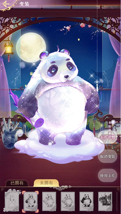 变装:除了华美的服装外,陛下还可以变装成其他可爱的小动物哦~这就需要用到“变装卡”,目前有兔小仙、雪人、九凤、食铁神兽、避水金晴兽....,有了这些变装卡,陛下想变成什么都可以哦,要注意变装卡是分永久与限时的~