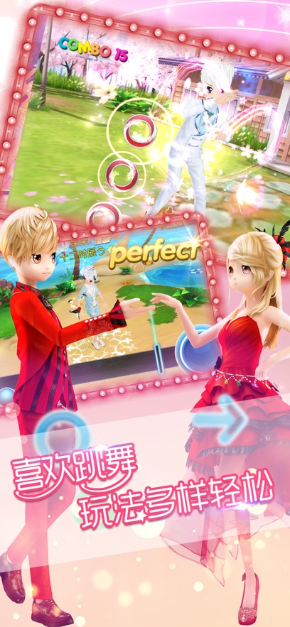 【操作方式】在舞台秀出自己的超强舞技,吸引Ta的目光,在选定舞伴环节,默契的给对方送上心动的玫瑰,邂逅初恋,双人共舞,畅玩浪漫甜蜜的恋舞世界。