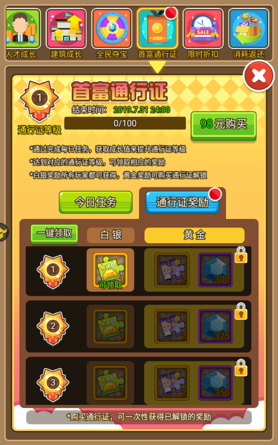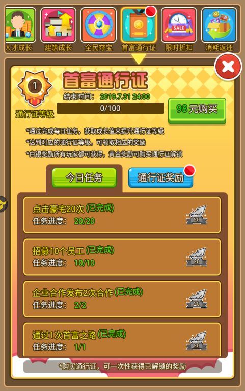 首先打开【福利界面】-【首富通行证】,活动时间截至到7月31日,每天完成简单小任务即可拿到对应点数的成长值,像点点豪宅、招募员工这些,简直简单得不得了!