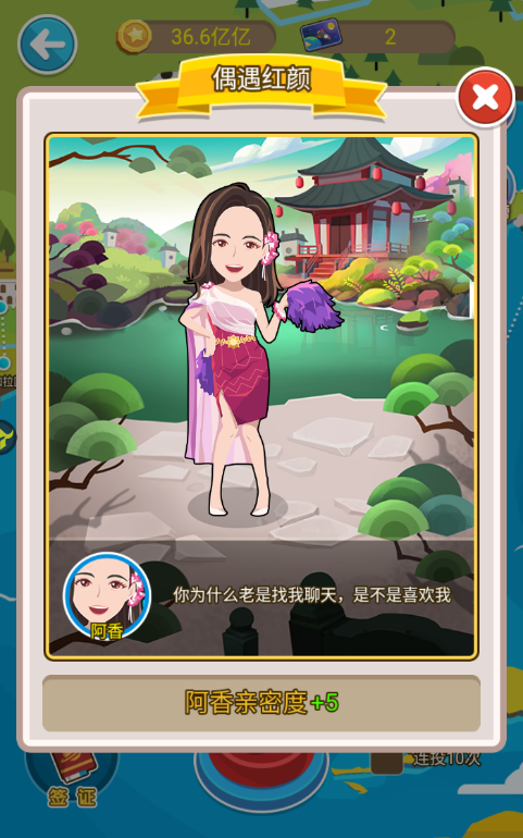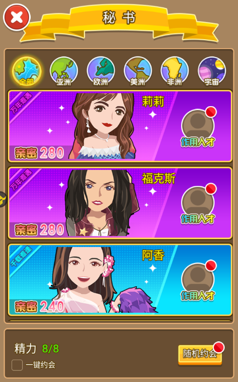 那么点开秘书系统,你就会看到目前老板你手下的秘书小姐姐,上边会显示你和她们的亲密度以及她们所属的地区,点击随机约会就可以增加秘书经验值。