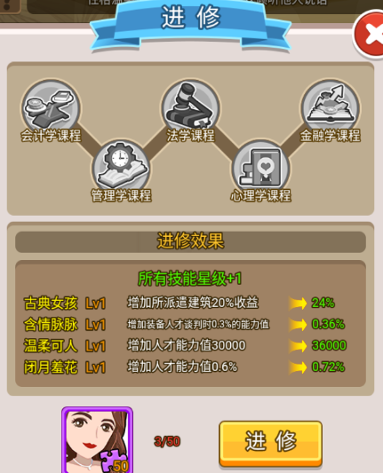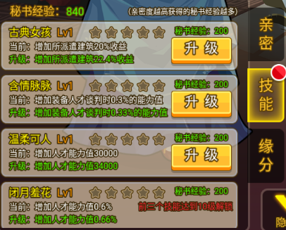 【技能】是能够提高秘书能力及作用人才的各项能力的,技能升级可以根据玩家需要选择性的去升级哪项能力~