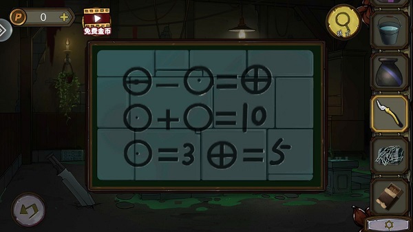 10、用【被包裹住的刀片】割开人形怪物的袋子,用【颜色诡异的碗】盛流出的酸。根据桌上的提示,用【装满了酸的碗】点击魔鬼藤,再用【被包裹住的刀片】割断,拿到【细绳】。