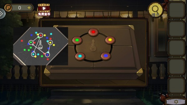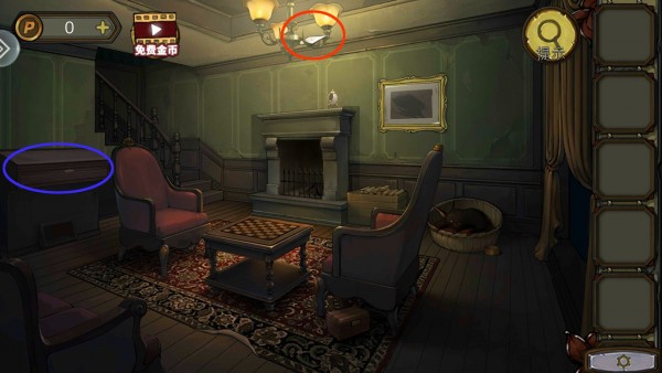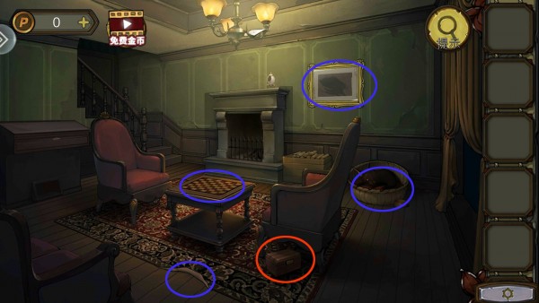 1、根据狗窝,画像,棋盘,地毯得出沙发旁箱子的密码,拿到狗粮罐头给狗狗吃,得到棋子,完成棋盘游戏(如图)拿到钥匙开琴。