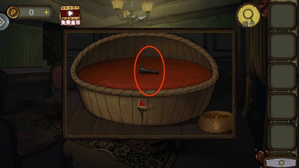 28、地上拿到铁桶,柜子上拿到红色瓶子和钥匙。在厨房把铁桶接满水。