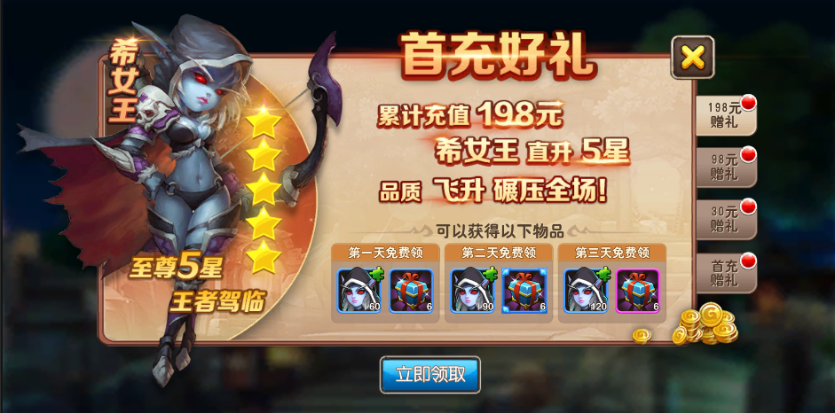 周卡+月卡+每日礼包。绝对是超级划算,极高性价比,不但可以无压力升级英雄,而且还可以获得双倍经验卡,精英副本重置券。这在游戏初期对玩家的成长都收益极大。
