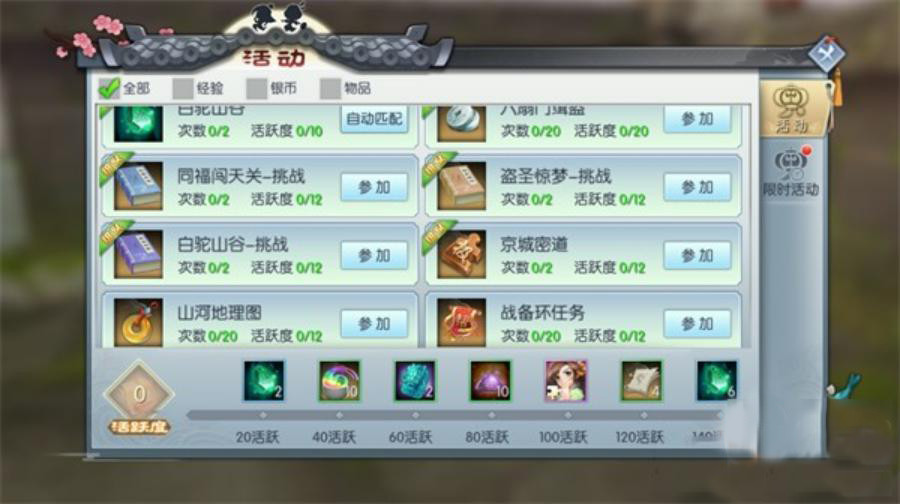客官可以点击主界面中的活动按钮,在活动列表中找到“同福闯天关-挑战”、“盗圣惊梦-挑战”、“白驼山谷-挑战”,点击即可参加活动。