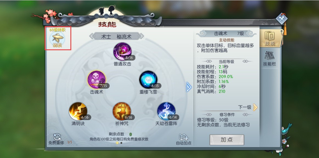 客官可在技能界面点击“转职”按钮开启转职。