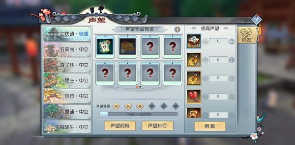 捐献声望的道具:银币、活跃度、各地图玉块、冰糖葫芦、声望令牌和榴莲。