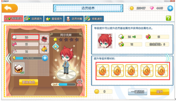 等级提升:提升等级可以用经验书也可以吃其他店员来升级(好残酷的喵星人世界)……可以手动挑选材料也可以交给系统君一键添加。这里要说一下,只有珍贵度在R以下的路人店员也就是N级店员会被一键添加,所以店长们不用担心自己心水的小哥哥会遭遇被吃掉的命运了。(什么?你说喜欢N级的?!emmm……)