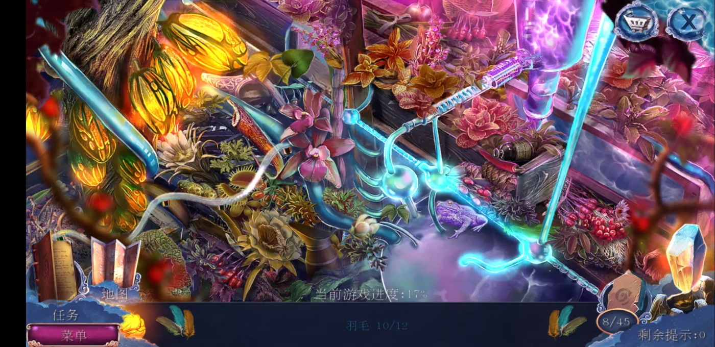 去果园,用坏了的镊子和导线开锁,得到氨水,回小屋,按配方制药,给神兽闻,开箱子,首先得到太阳标志,开锁,得到春天图片,弄成一半花一半树。