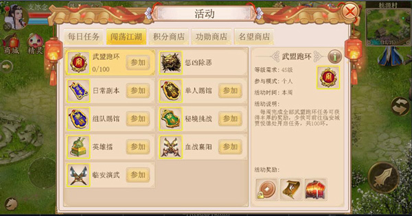 14级开始,主要通过找玩家组队,野外挂机练级;在挂机的同时,可在地图中适当接取任务,在挂机之余额外获得一些任务经验。 15级时,开放了第1个游戏副本——临安旧城(通过“临安城”的驿站车夫进入)。 在副本中,你可获得与副本等级相同的装备,几个boss则是必掉好汉(含)以上品质的装备。 20级,开启了日常任务,这时候可以逐步通过日常任务获取大量的经验,快速提升任务等级。 30级时,可在世家阵营可在“襄阳卫穆东山”/江湖阵营可可“南少林永渡”处接取坐骑任务,完成后可获得“马牌”。