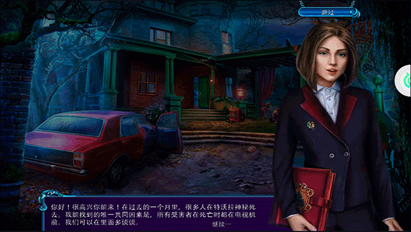去教授房子外面,牌子,刀子拧松螺丝,用钳子剪断扬声器、雕塑的眼睛1/2。组合播放器和安扬声器,磁带,得到播放器。去教授家室内,实验室门,用播放器打开,进去。