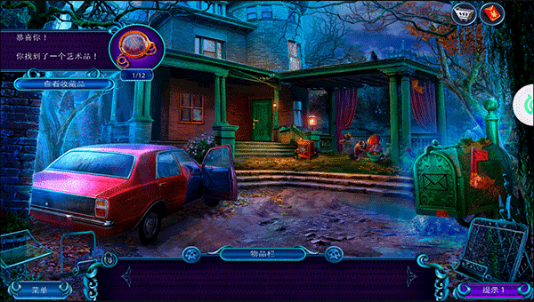 右侧展示板,使用线,按关键词(发光的文字)寻找图片中相应物品,得到护身符。护身符与红色笔记本组合,得拼图碎片2/2、警察电话号码。