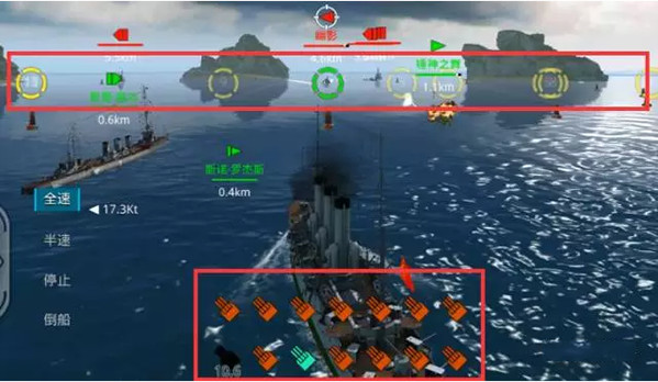 5、那么问题来了,怎么样才能更有效的提高输出呢?其实呢海战中有一种姿势叫做T头,也就是我方战舰用侧舷对着敌方战舰的船头,这样我们就可以同时使船首炮塔与船尾炮塔同时射击。