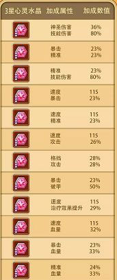 共有24种不同属性,需要搭配英雄技能及定位进行选择。升级时属性会随机变化,可以花费金币和魔法之尘进行转换,不过前期不推荐转换,资源不够的话,可以在橙6时转换需要的属性进行过渡。还有一个锁定功能,在升级水晶时属性不会变化,但是成本很高,不推荐。