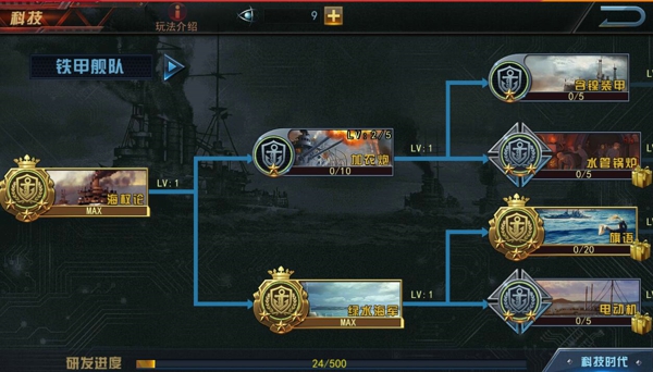 在科研中心中,我们能直观看到海上科技的变化,游戏中共分为4个科技时代,分别是铁甲舰队时代、无畏之海时代、海军假日时代和激战海空时代。在铁甲舰队时代,列强海军发展处于一个缓慢的瓶颈时期,而1906年无畏舰的诞生使海军发展迎来了大舰巨炮时代。此后在海军假日时代,列强各国等待机会寻求新的突破。直到激战海空时代到来,航母母舰取代战列舰成为新的海上霸主。