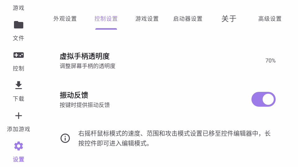 1、不论是键盘模式还是手柄模式,进入后点击控件都能单独进行设置,这里以手柄模式为例。单点任何控位都能进行详细的设置,比如名称、类型、形状、大小、透明度等等,还能点击下方进行删除和复制。机型不同软件内某些部分可能会显示不完全,但不影响使用。