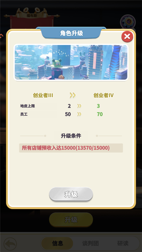 3、进入已建成的店铺界面,消耗金币点击升级,提升店铺知名度等级,等级提升后店铺的收入倍率会增加,收益随之变高。