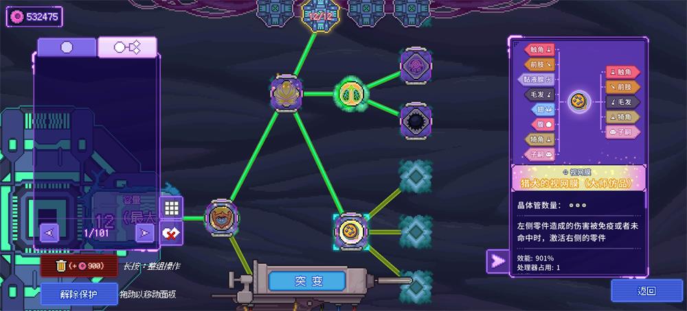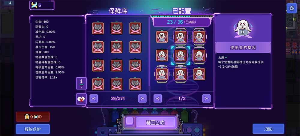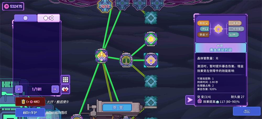 5、通关后会随机获得不同的基因和器官,你可以自由搭配来构建自己的流派。