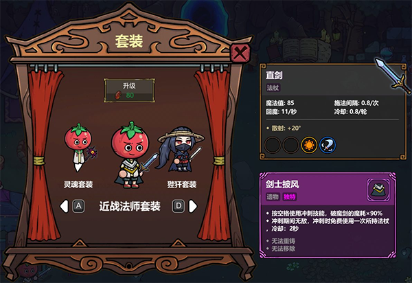 2、近战法师套装自带的法杖是「直剑」,自带法术增强「范围增强」和法术飞弹「破魔剑」。同时还会有一个独特遗物「剑士披风」,该遗物无法重铸,无法移除。