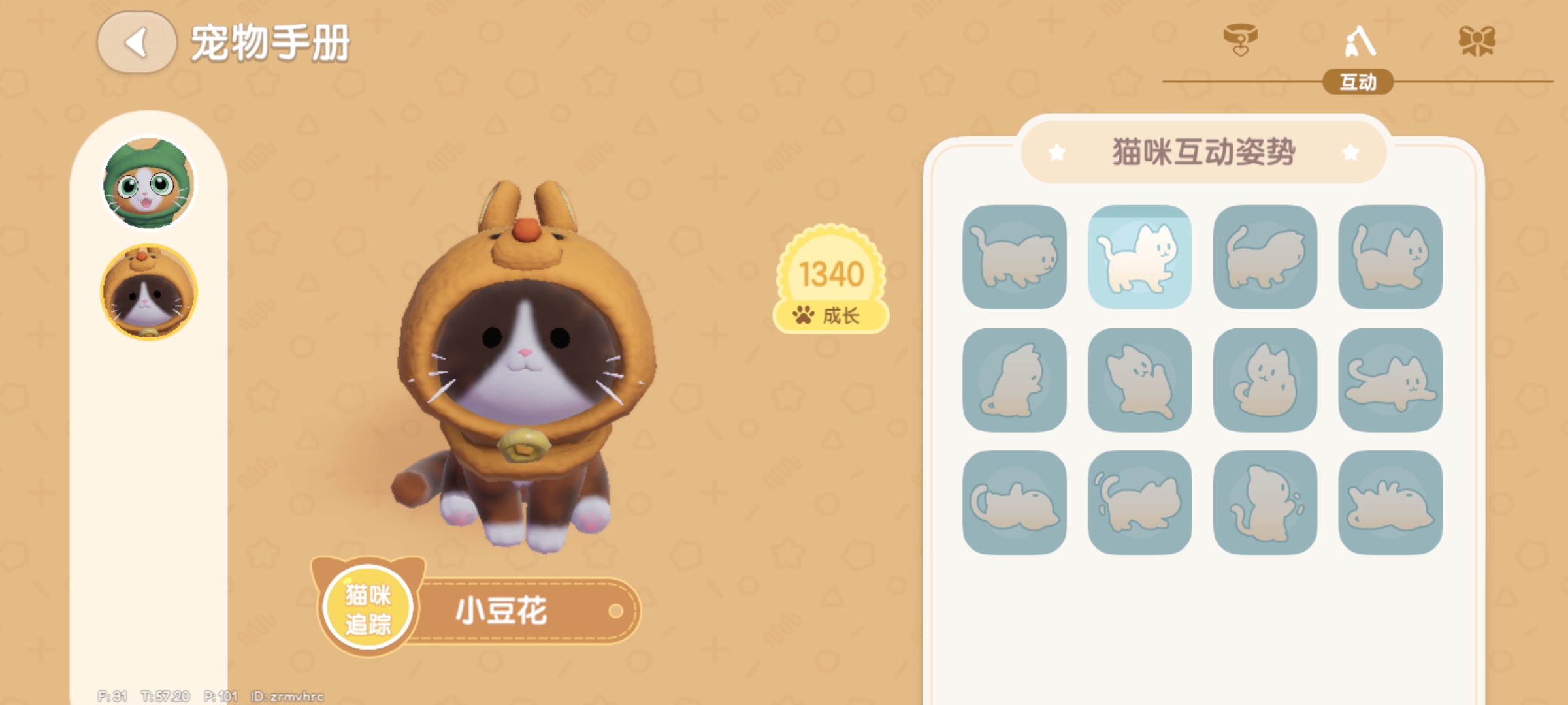 5、当猫咪爱好等级到达5级时,靠近猫咪点击第四个选项,猫咪可以跳到自己脑袋上。