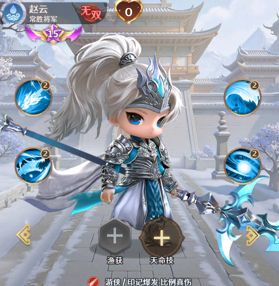 无双·赵云(水系,抗伤回复):专克制敌对高爆发武将,七进七出的天赋属性淋漓尽致展现出来(首冲礼包即可获得,后续升星所需材料也比较简单)。