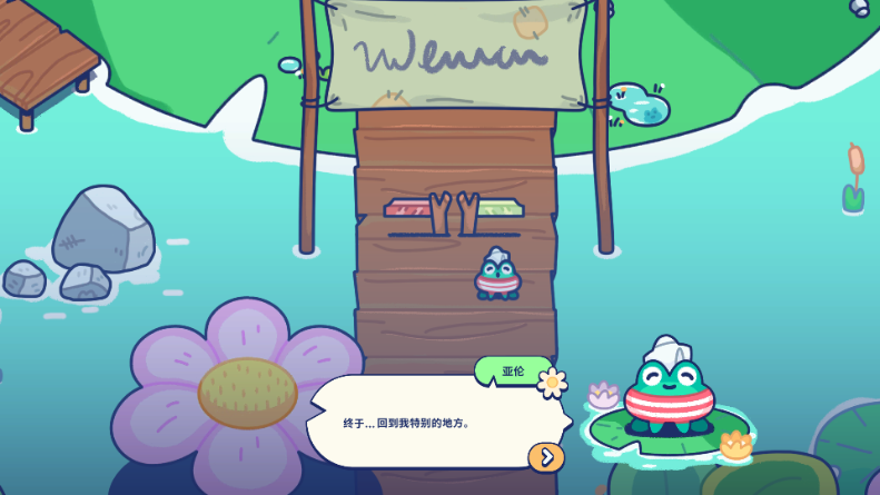 2、小青蛙亚伦有一个梦想:把他的池塘变成世界上最美的豪华露营地,但他却不擅长与人相处。你能帮助他吗?