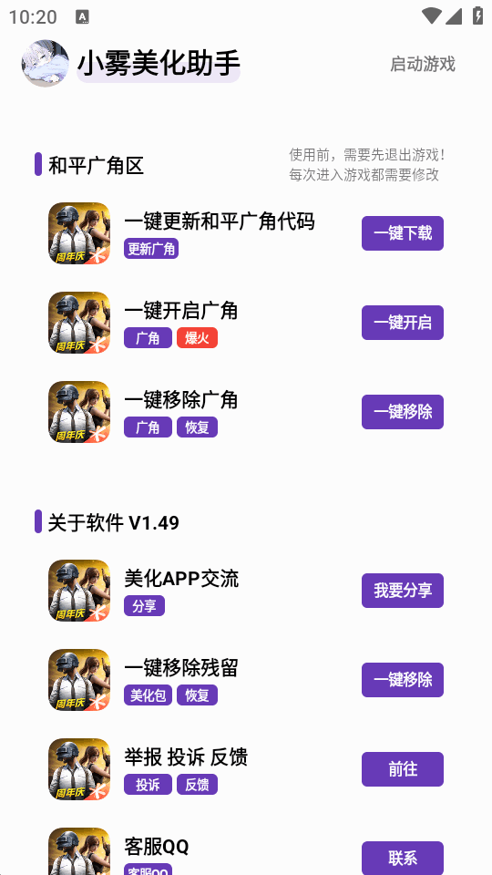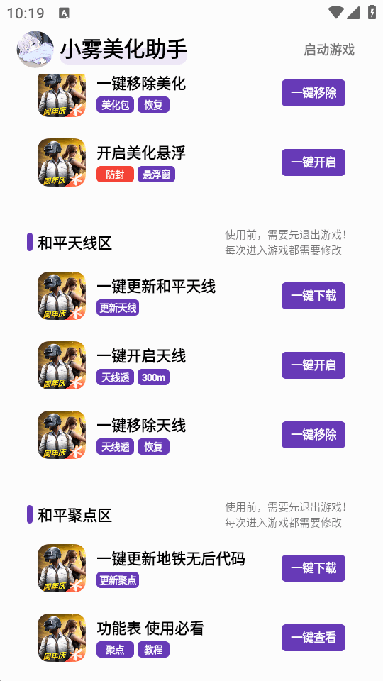 专门为和平精英吃鸡游戏打造的一款美化助手,小雾美化助手app是最新的版本,支持最新游戏安装包,可一键开启美化,快速开启悬浮窗功能,一键更新游戏,还有各种游戏代码等教程内容,喜欢玩吃鸡游戏的玩家必备。