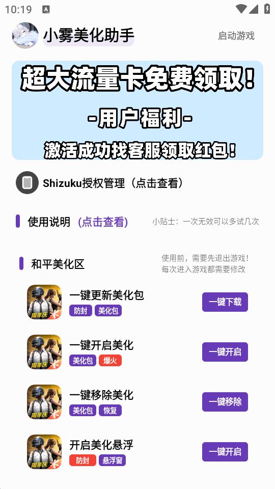 开启美化防止启动游戏时意外闪退操作(移除美化→进入游戏,到游戏登录界面→退出游戏→回到"小雾美化助手"开启美化→重新进游戏即可完成美化!)(仅启动游戏出现需更新资源时执行的操作)