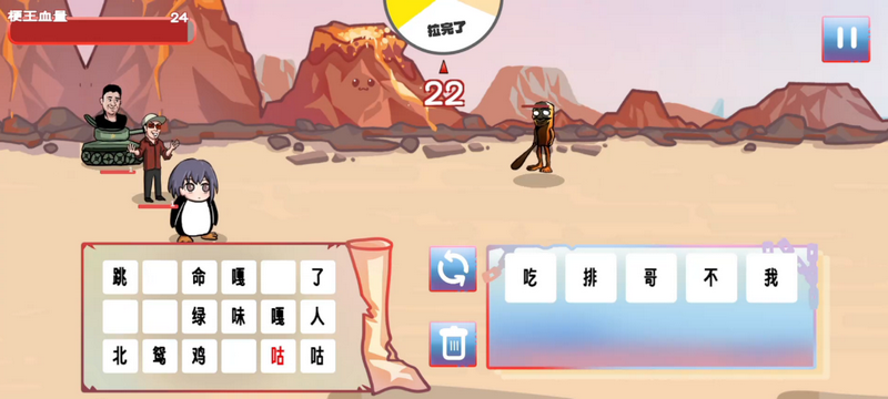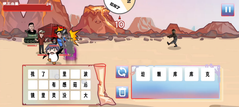 1、每波敌人来袭前,系统打乱一组汉字,玩家需快速从中拼出有效热梗词组。