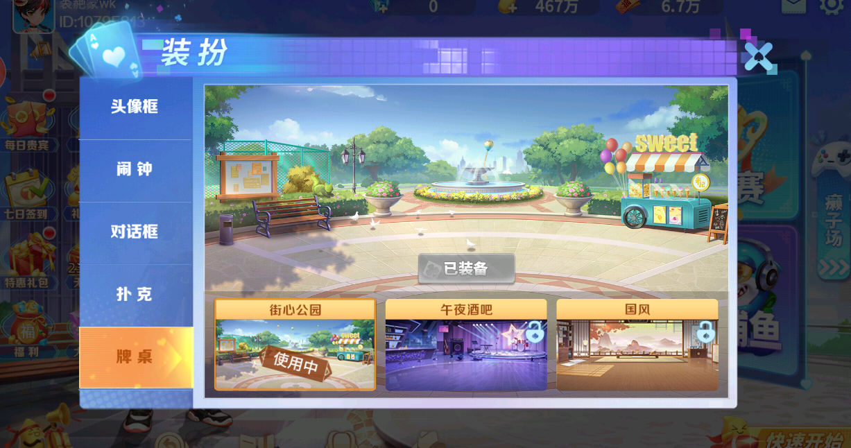4、在大厅里点击装扮,可以更换游戏场景、扑克样式、对话框等。