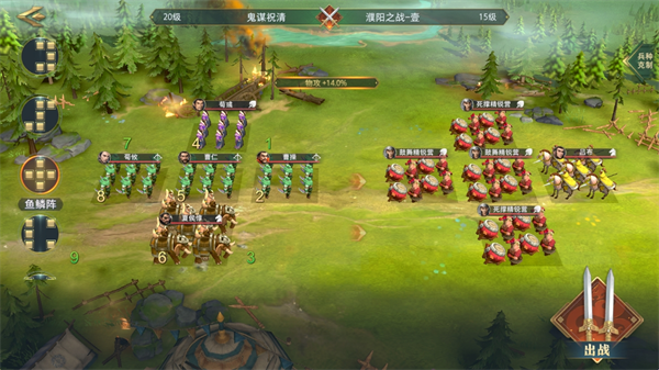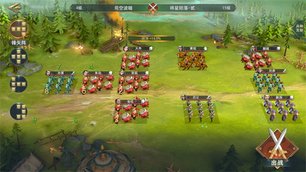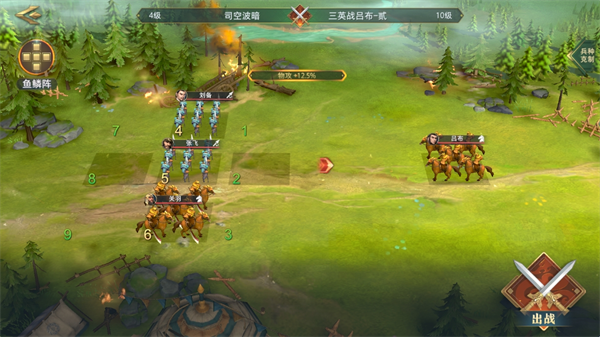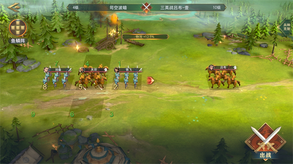 通关攻略:孙坚、韩当切换兵种为投石车,对位刘表,阵型使用增加物攻的鱼鳞阵,其余武将保持兵种克制对位即可。