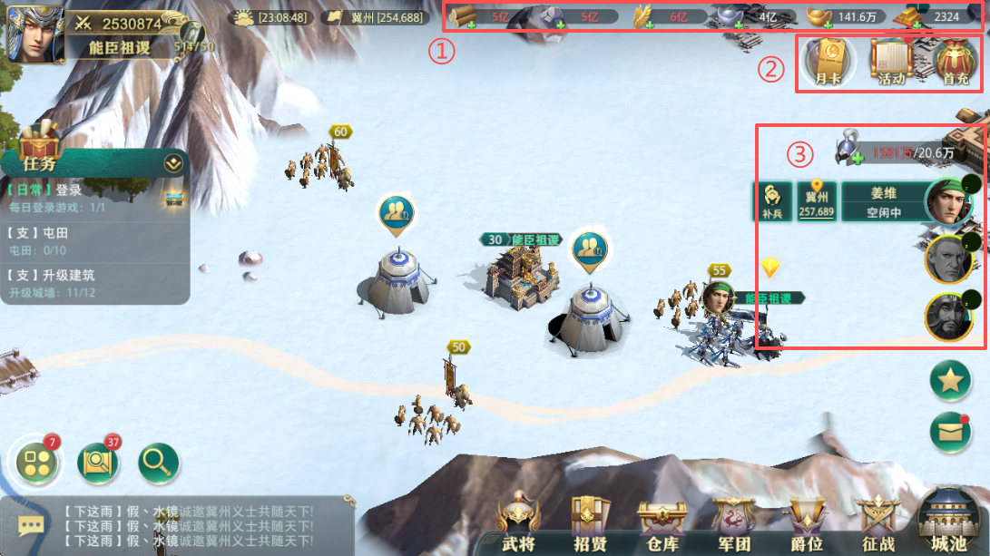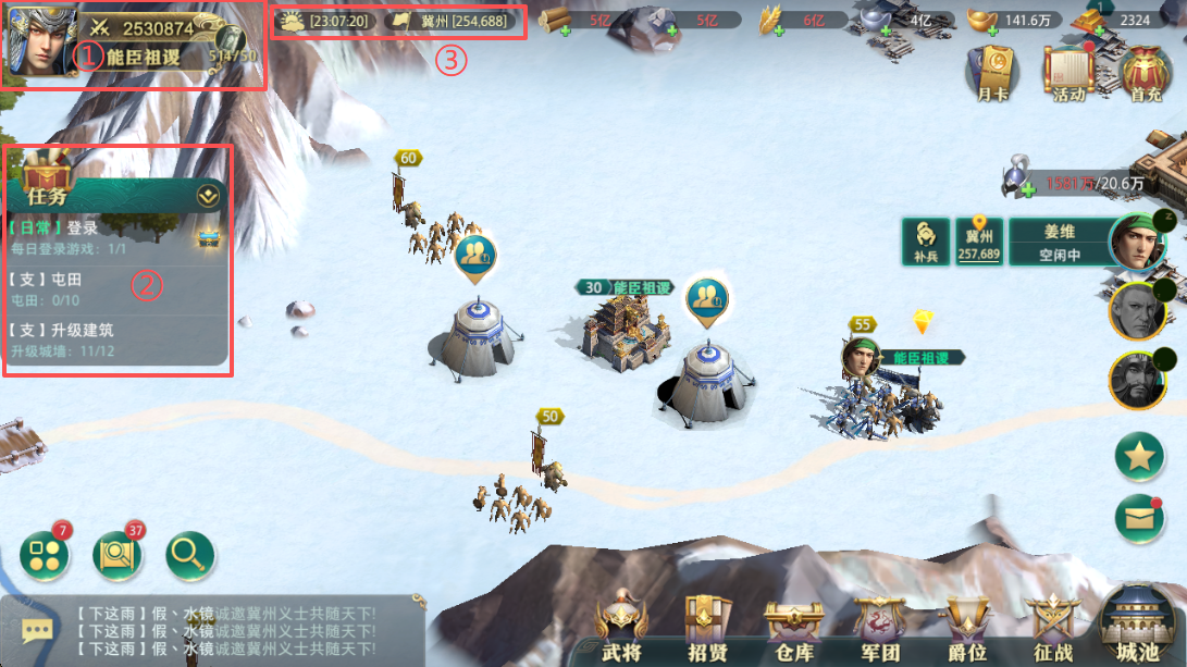 这里主要展示角色的基本信息,比如头像、头像框、战力值和角色名等。其中,军令数值尤为重要。军令是游戏中非常稀缺的资源,使用时需要好好规划,合理安排。新主公们可以点击军令按钮,查看军令的恢复情况,也能购买军令。
