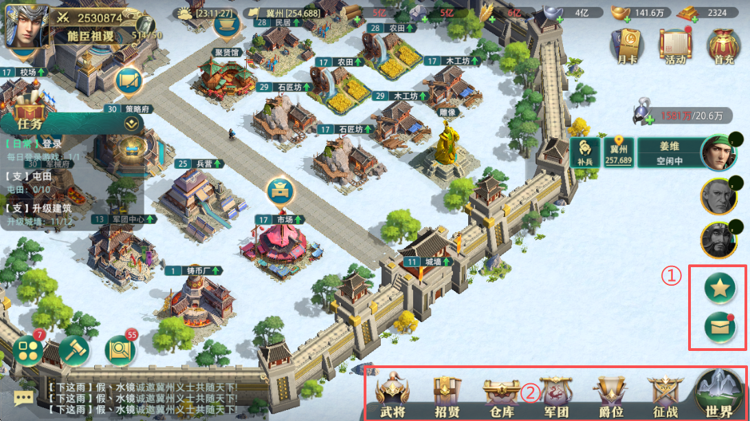 右下角的这一列按钮功能清晰明了,都是游戏中最重要的功能。相信新主公们对这些功能按钮不会有太大疑问。