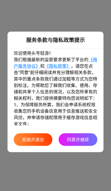 1、打开头号轻游app,点击同意隐私政策