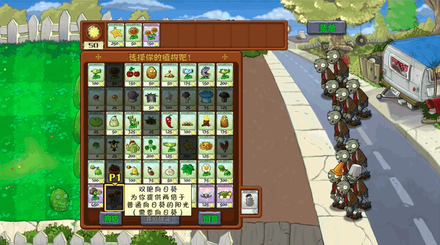 6、在选卡界面,选好了植物之后,可以点击“开始游戏”按钮开始游戏。没选好就点击“开始游戏”按钮则不会有任何效果。