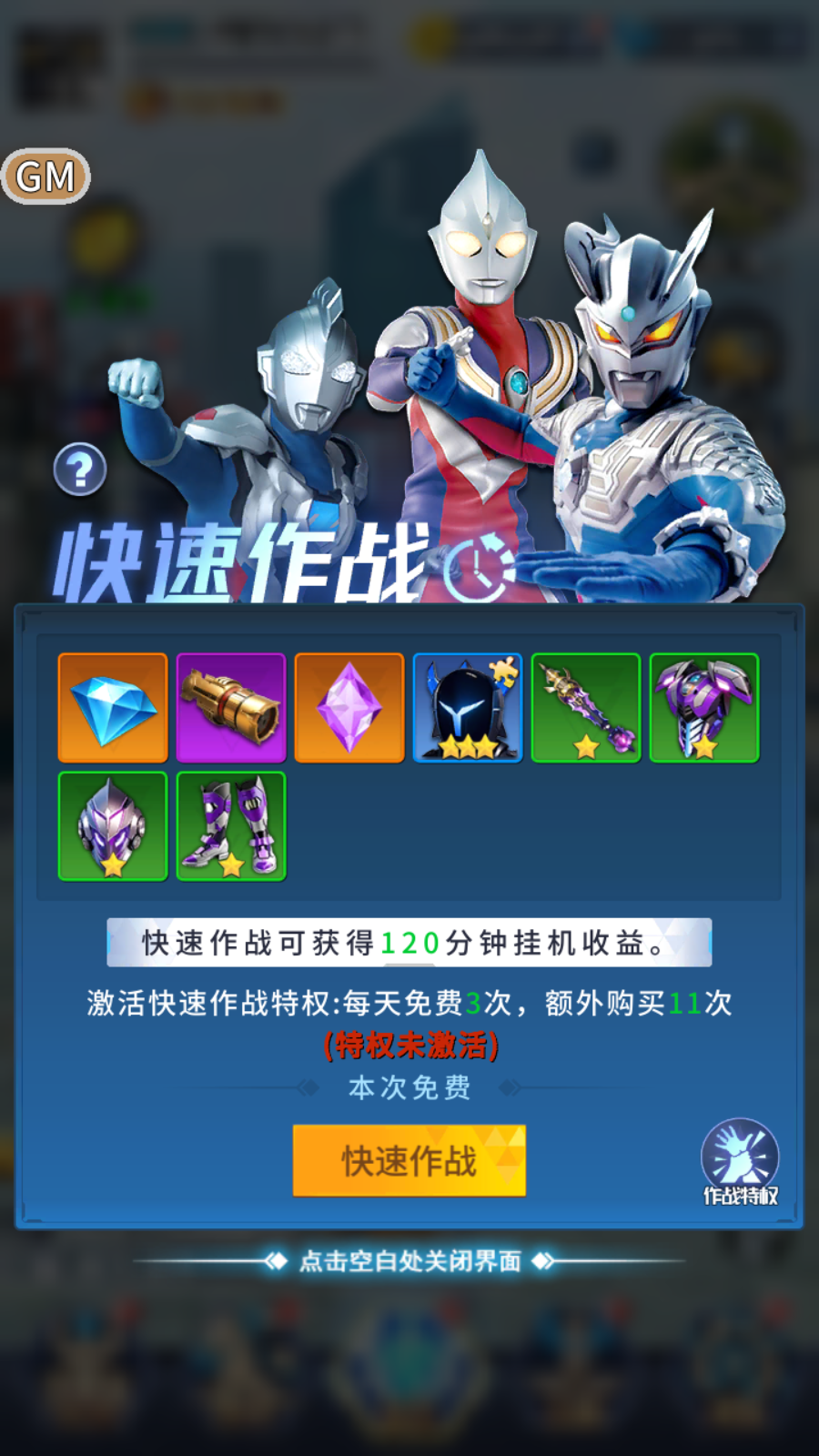 在冒险界面选择[快速作战],直接获得2小时的挂机收益,试过的都说好(每天可免费3次哦~)