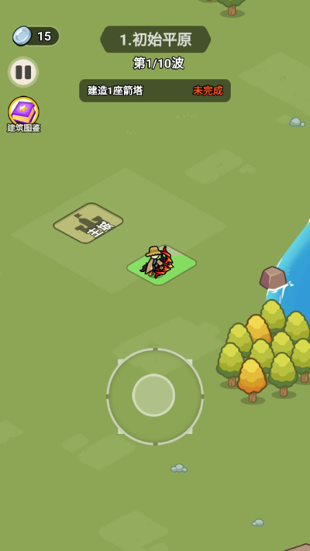 1、开始游戏后,拖动摇杆控制英雄移动,建造各种建筑。