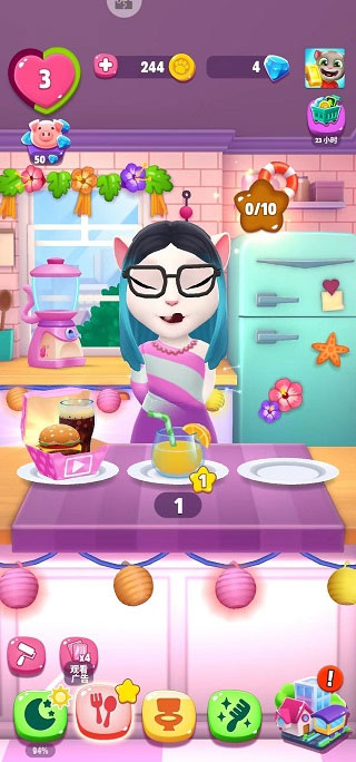 在安吉拉的厨房,我们需要注意不少事情。我们可以去点击后面的冰箱,购买食物,让安吉拉一口吞下。但并不是什么东西都是可以去吃的,餐桌上的饥饿药水,如果我们让安吉拉喝下后,就会导致她的饱腹感变为0,我们让安吉拉吃下去的食物也会毫无作用。安吉拉后面的榨汁机如果频繁使用,会发生巨大的爆炸。而且会溅到页面上来,我们就需要多次点击污渍,才可以去除哦!